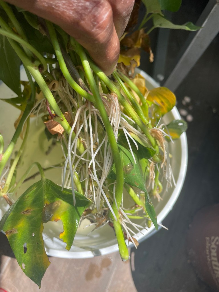 Thankfully, the sweet potato vines are easy to clone. I visit one of my many well-established sweet potato patches, snip off a vine & place it in a small bucket of water. Within a week the vines have grown roots & are ready to plant🤲🏾